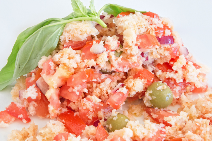 Panzanella is an Italian salad made from pieces of stale, moistened bread, with the addition of tomatoes, onions, or basil, and a dressing of vinegar and olive oil. The salad is a specialty of Tuscany, where it is usually served in the summer, making use of the fresh summer vegetables that are in season.