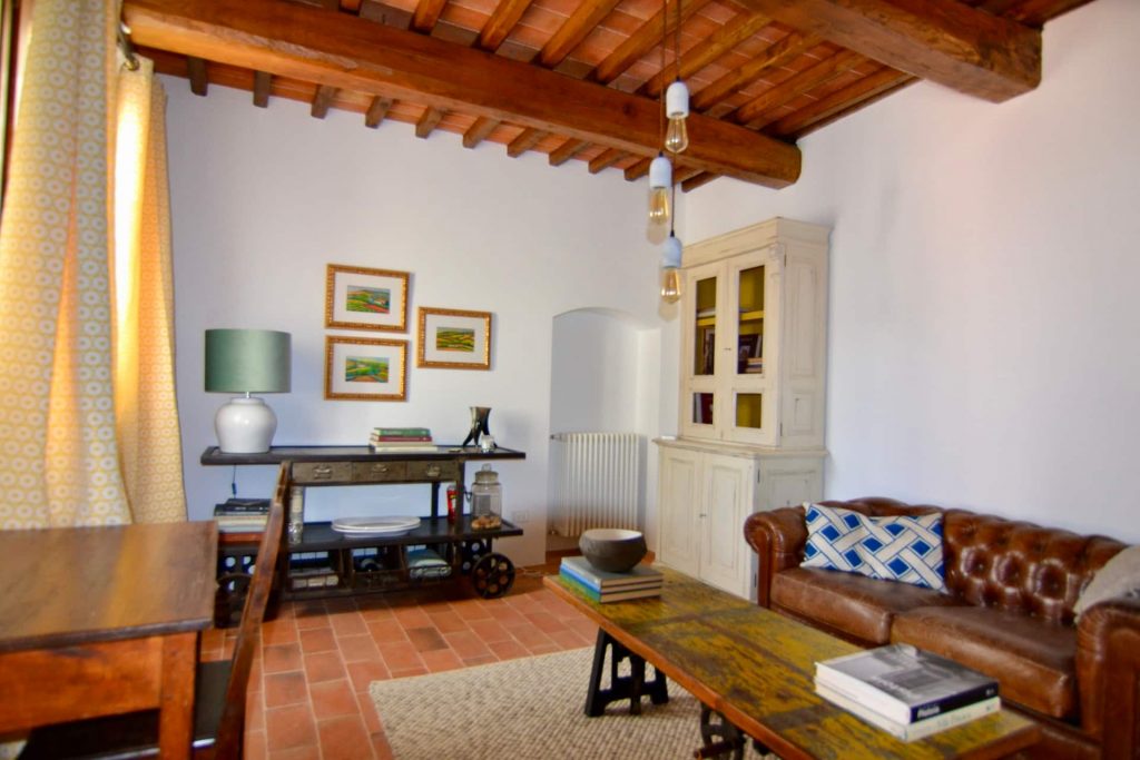 The spacious living area will allow you to relax, accompanied by the view of the rolling Tuscan hills and an outdoor area with table and chairs for dining al fresco.